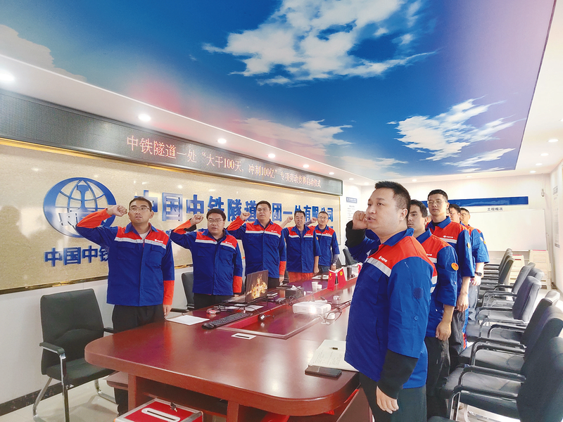 为全面落实中铁隧道局“五比五保决战120天”劳动竞赛部署,以竞赛促生产、以竞赛强管理,全力以赴攻坚年度各项任务目标,9月30日,一处召开“大干100天 冲刺100亿”专项劳动竞赛誓师动员大会;10月10日,四处召开决战决胜四季度劳动竞赛专题会。图为大清高速项目部进行宣誓。
