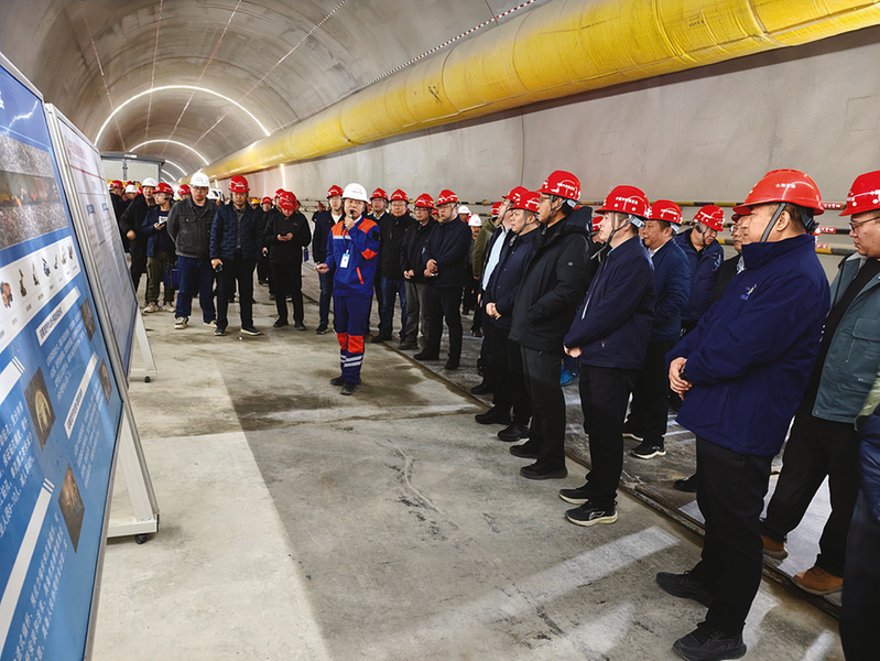 在项目黄家塬隧道1号斜井,现场负责人详细讲解了隧道衬砌智能养护、智能衬砌台车、大机作业面设备配置、衬砌水平定向冲顶、衬砌打磨喷涂机器人等工装设备特点及应用效果,向观摩人员展示了衬砌外观质量、衬砌“V”型缝、填充面平整度控制、防排水施工等工艺,吸引了观摩团驻足观看、拍照记录和交流探讨,其工艺细节把控和整体品质提升得到了各方肯定和赞誉。