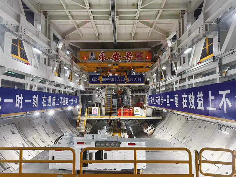为攻克复杂地质难题,集团公司组建专家团队,深度研判沿线地质水文条件,量身定制了直径14.29米的国内最大直径土压/TBM双模盾构——“永安号”。这台“大国重器”可实现土压盾构与TBM 两种模式快速切换,精准适配软弱围岩与硬岩两种极端地质环境,兼顾施工安全与效率。同时,“永安号”深度融入智能建造理念,搭载管片智能吊运、超前地质预报、有害气体监测等六大核心辅助系统,形成全方位智能管控体系。项目团队同步打造大盾构智慧管控中心,研发协同管控应用系统,通过实时采集、分析掘进数据,为盾构掘进提供精准决策支撑。
