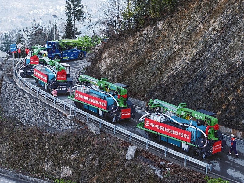 运输的台车、吊臂,体型庞大、重量惊人,如何安全平稳地通过险峻山路,是摆在所有人面前的严峻考验。项目领导班子带队踏勘,项目团队“抢晴天、战雨天”,抢修便道、拓宽转弯半径、加固薄弱路基,硬是在悬崖峭壁间为大机开辟出一条“生命线”。2025年3月16日,首批16台大型机械化配套设备,如同移动的钢铁长城,缓缓驶入现场。第一台三臂凿岩台车稳稳停在隧道洞口,正式拉开了宜涪高铁机械化施工序幕。